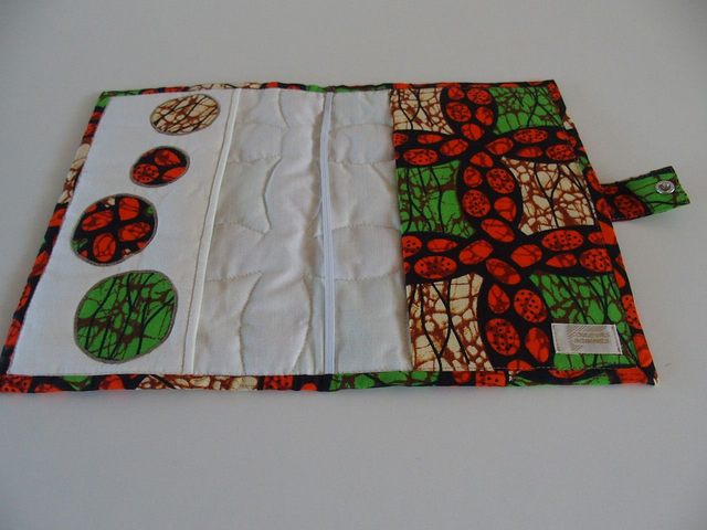 Étui de protection pour le carnet de santé en tissu Wax matelassé avec un léger molleton synthétique.