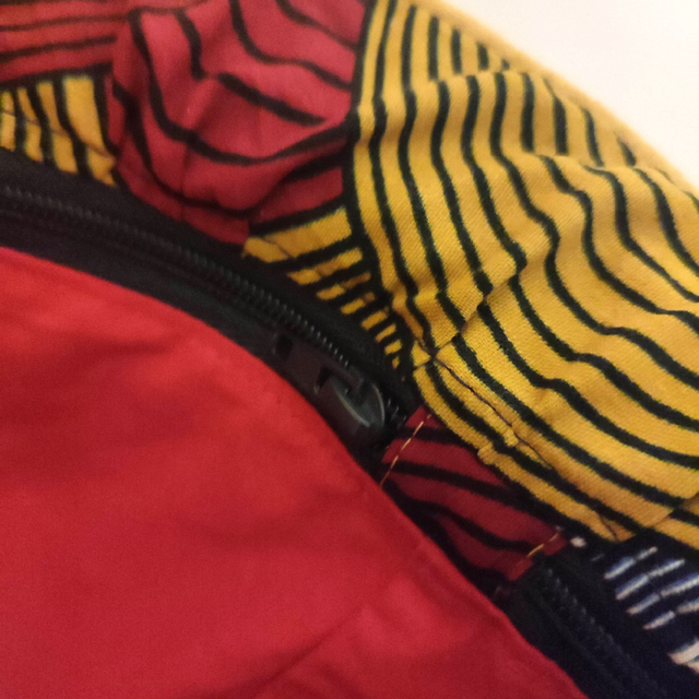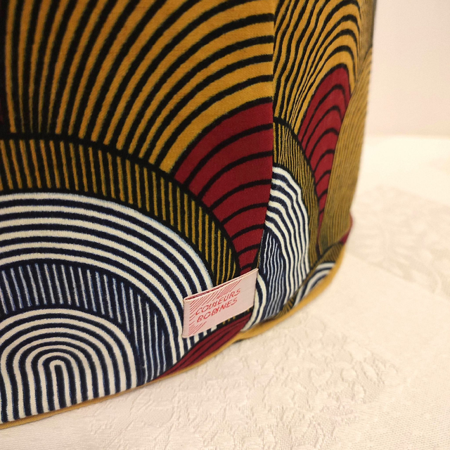 Description : Housse décorative en tissu Wax véritable, coloris rouge sombre, bleu marine et jaune moutarde, déhoussable et lavable