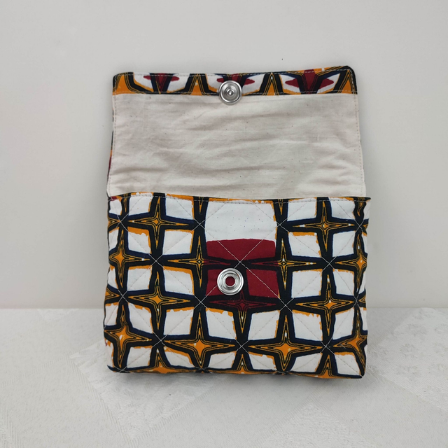 Modèle Mattia en tissu coton Wax imprimé losanges blanc sur couleurs jaune, rouge et noir.