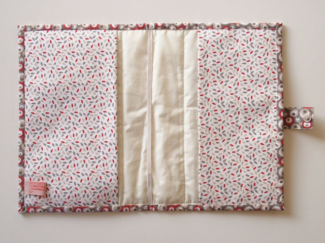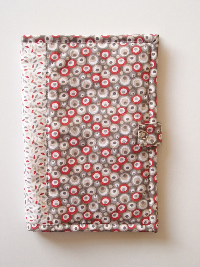 Étui de protection pour carnet de santé, un duo de tissu coton imprimé bulles et plumetis gris écru rouge.