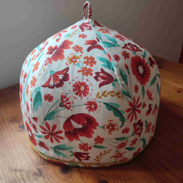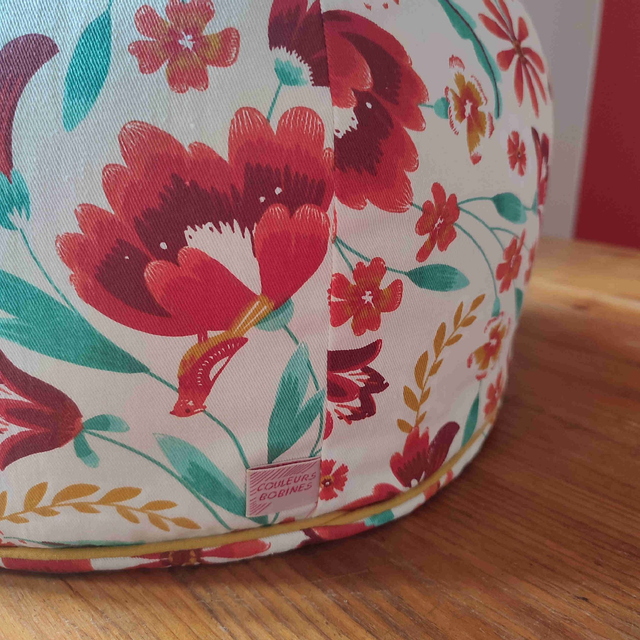 Housse décorative en toile coton écrue claire imprimée fleurie orange et bleu paon.