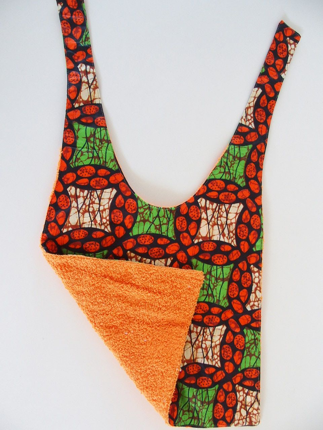 Grand bavoir Wiki en tissu Wax à dominante orange.